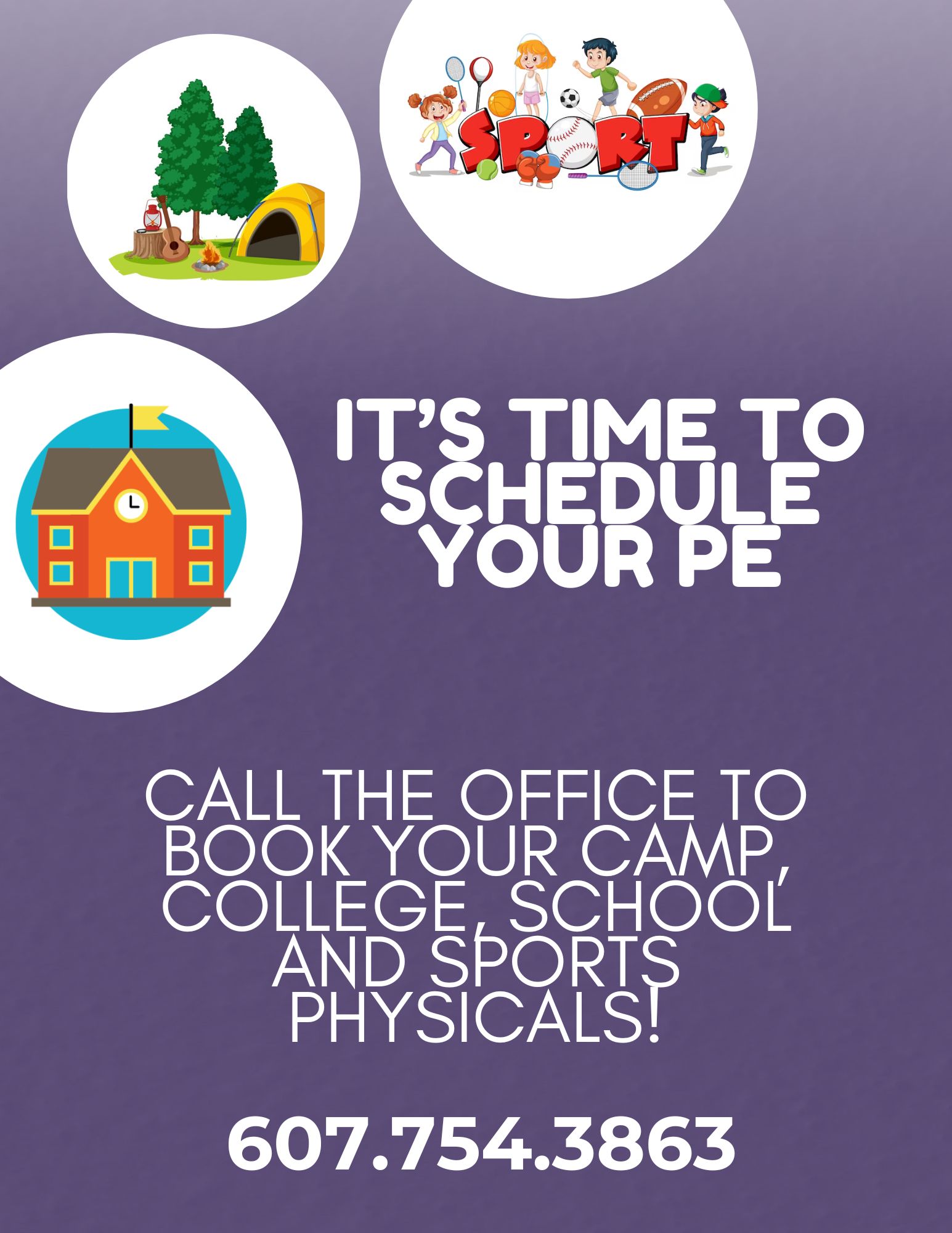 Call our office to schedule your camp, school, college and sports PEs. 607.754.3863. Or request an appt through the patient portal!